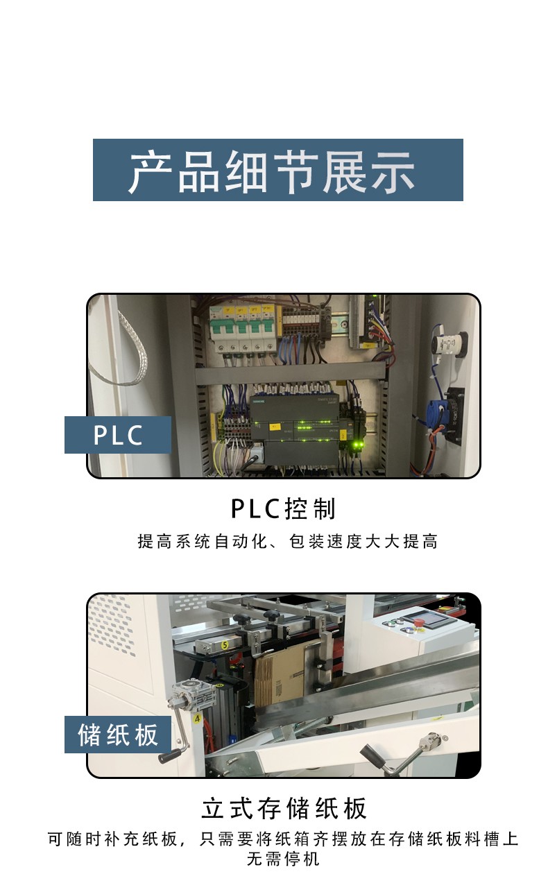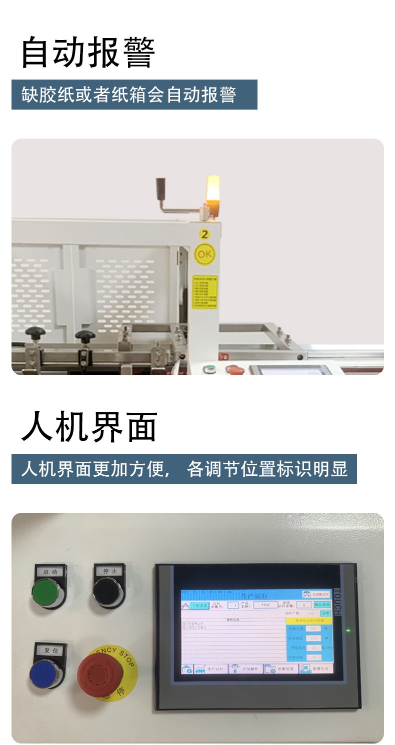 3. 自動化連續作業,降低無效工時設備通過 PLC + 觸摸顯示屏實現全流程自動控制,可完成吸箱、開箱、成型、折底、封底的一體化操作,無需人工介入單個工序。同時配備缺料提前報警、無料自動停機等裝置,避免空轉浪費,有效提升設備的有效作業率,減少人工值守的無效工時。