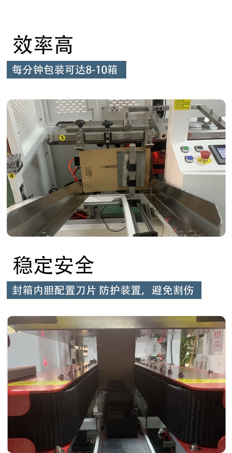 2. 封箱效果穩定,提升包裝標準化設備采用專業精密的凸輪連續系統,運轉過程無振動,配合優化的貼帶器設計,封箱時膠帶貼合平整、密合牢固,不會出現跳帶、漏封、折角不規整等問題。紙箱兩端的封箱膠帶折角長度還可按需定制,確保所有包裝成品的一致性,提升產品出庫的整體美觀度和標準化水平。