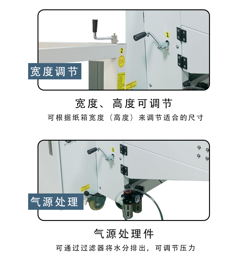 • 紙箱適應性強:適用紙箱范圍廣,不同大小紙箱調整簡便快捷,變換紙箱規格時,手動調整一般只需 1-2 分鐘。