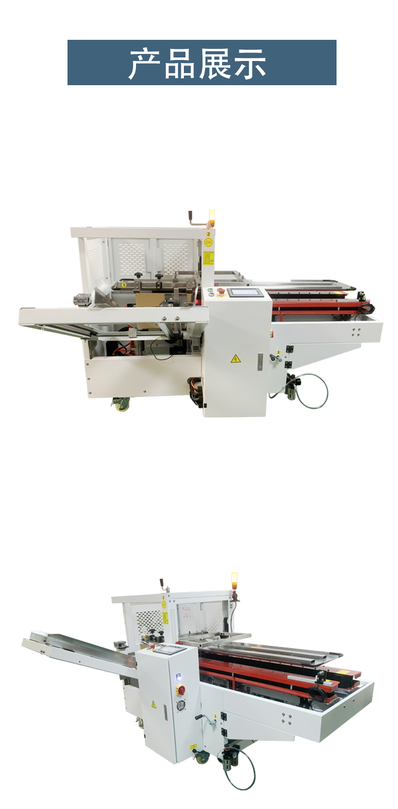 • 自動化程度高:一次完成紙箱吸箱、開箱、成型、折底、封底等包裝工序,可大大減少生產人員和勞動強度。