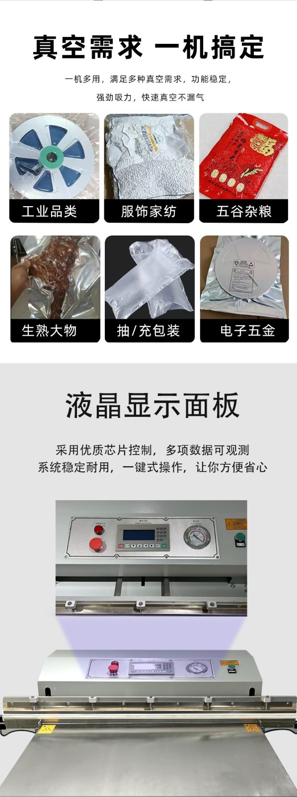 外抽真空包裝機是一類外置式抽氣的包裝設備,通過將抽氣嘴伸入包裝袋內完成抽真空、封口作業,適配各類包裝袋(尤其是大尺寸、異形件包裝),廣泛應用于電子元器件、五金配件、食品、醫藥、家紡等行業。