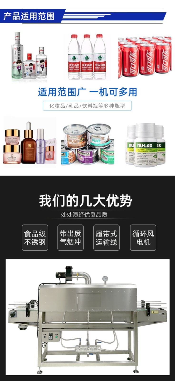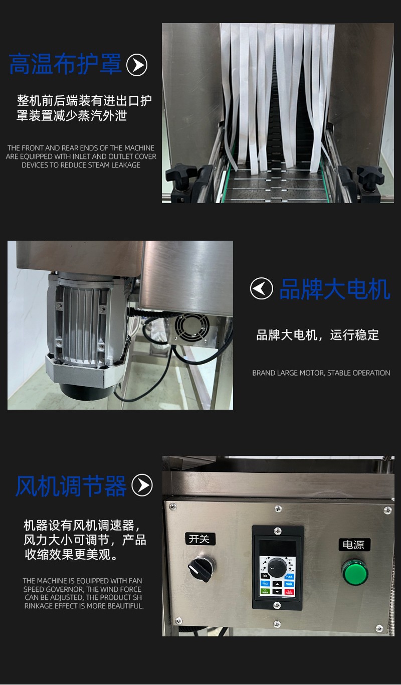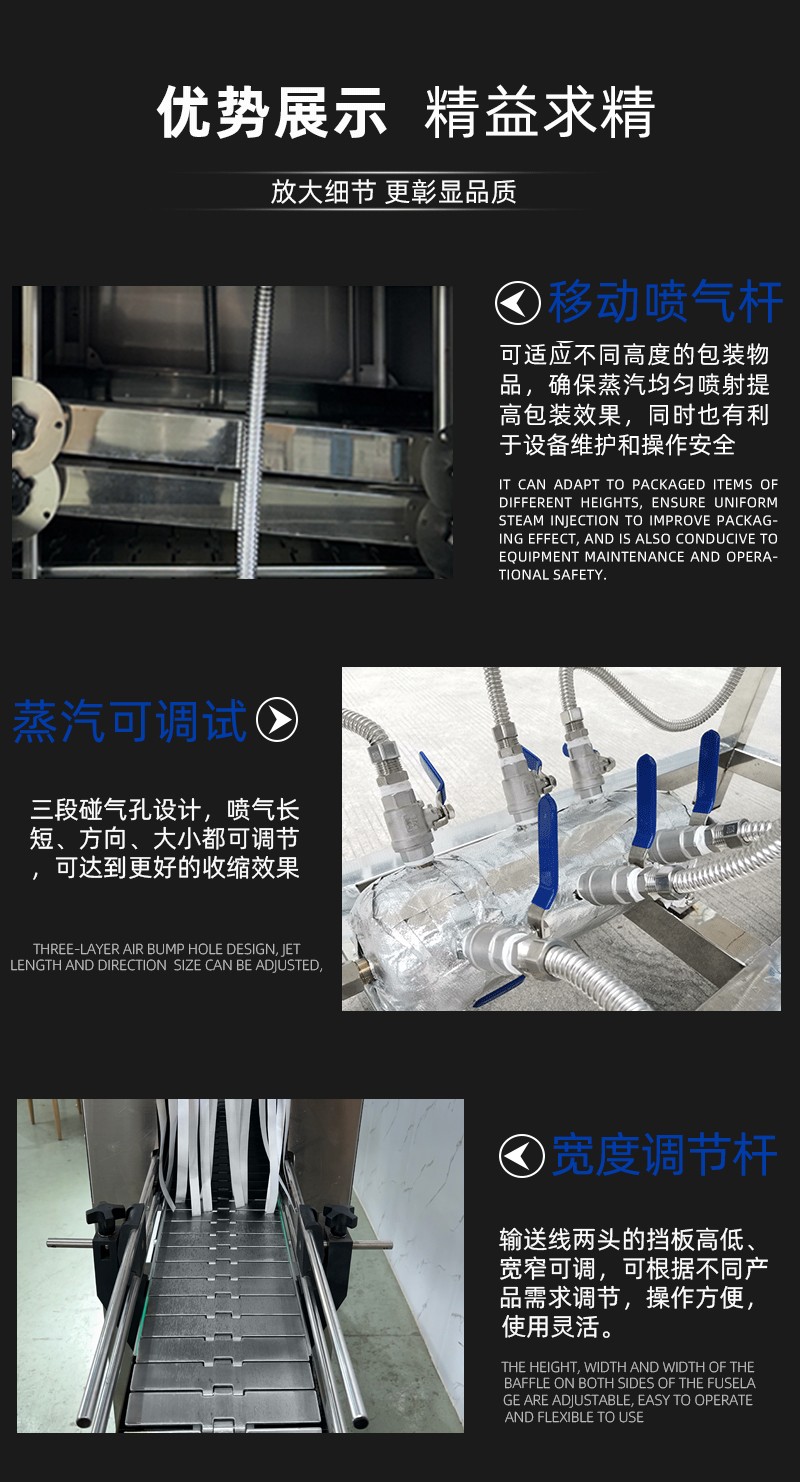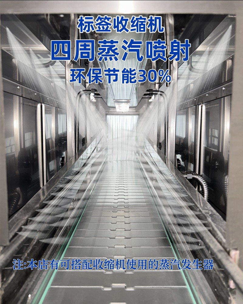 • 收縮通道:內部設有蒸汽噴射孔或噴嘴,通道長度與寬度根據產品尺寸可調,以確保蒸汽均勻覆蓋。