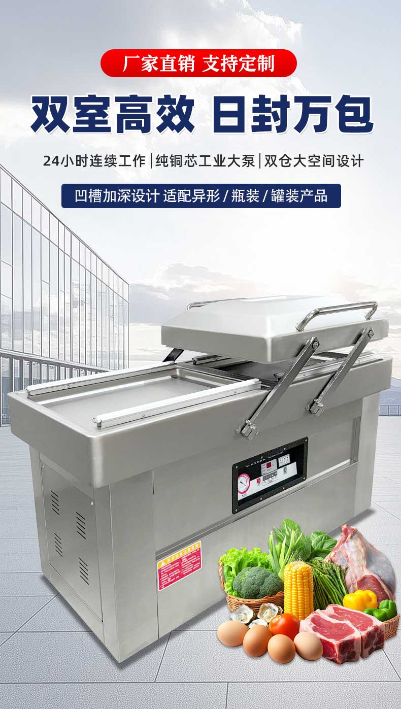 雙室真空包裝機可在真空包裝的基礎上,向包裝袋內(nèi)充入氮氣、二氧化碳等惰性氣體或混合氣體,起到更好的防腐、防潮、防氧化等保質(zhì)效果