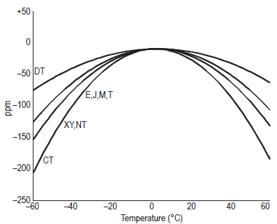 圖4顯示了幾次低頻切割的頻率溫度曲線.J形切口使用頻率低于10kHz,而XY形切口可以使用頻率在3kHz至85kHz之間.NT切割可以在10kHz范圍內使用.DT切割適用于100千赫至800千赫,CT切割適用于300千赫至900千赫. 負載電容