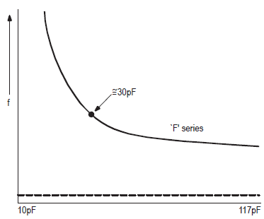 圖5顯示了頻率變化對負載電容變化的影響的典型曲線.或者,通常將晶體的可拉性表示為負載電容每pF變化的微調靈敏度,單位為ppm.這由以下單位以ppm/pF表示: