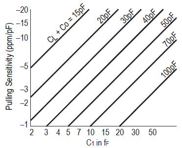 其中C1,C0和CL都用相同的單位表示.圖5顯示了頻率變化對負載電容變化的影響的典型曲線.或者,通常將晶體的可拉性表示為負載電容每pF變化的微調靈敏度,單位為ppm.這由以下單位以ppm/pF表示: