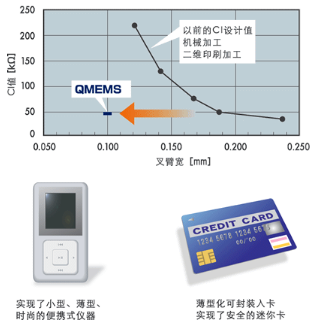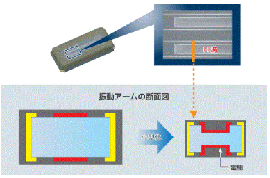 超小型音叉型晶體單元/超小型實時時鐘模塊,使用光刻技術對振動片進行三維立體加工,不改變以前的構造(左圖)進行小型化時,電極(紅色部分)的面積會變小.通過形成H型槽的構造,既確保了電極的面積,又提高了電解效率. 因此實現了即使是超小型晶振也具有與以前的規格同等的低CI值.