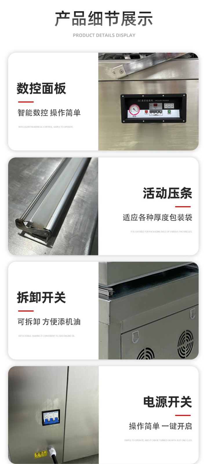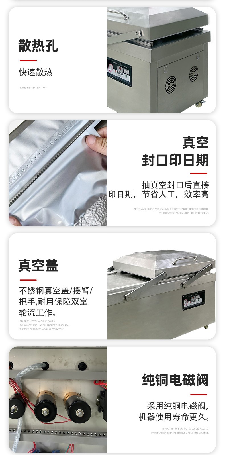 - 真空室:通常由不銹鋼制成,具有兩個對稱的工作室,可同時進(jìn)行真空包裝操作,提高工作效率。工作室底部為平板狀,便于放置包裝物品,且易于清潔。