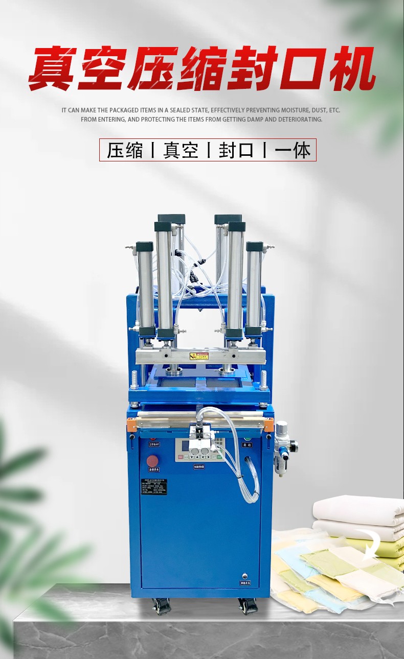 - 放入機器:將裝有物品的包裝袋放入真空壓縮封口機的工作臺上,將袋口平整地放置在封口條上,然后合上機蓋或啟動相關裝置,使包裝袋處于密封的工作腔室內。