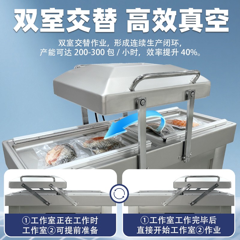 • 雙室設計:一個真空室在抽真空時,另一個真空室可以擺放包裝物,交替工作,節省操作時間,提高包裝效率。