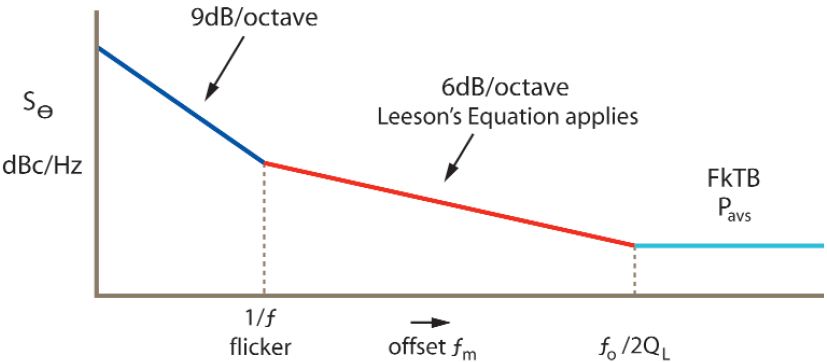 其中Q1是電路的負載Q,m是來自載波的頻率,c是閃爍噪聲角頻率,o是載波(振蕩器)頻率,T是開爾文溫度,Paves是通過諧振器的功率,F是有源器件的噪聲系數,k是Boltzmann常數.