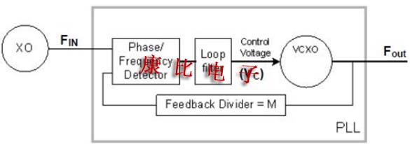 鎖相環(huán)通過將壓控振蕩器時鐘頻率和相位除以反饋分頻器(M)的值,并將其與相位/頻率檢測器中輸入時鐘頻率和相位(FIN)的相位和頻率進(jìn)行比較,從而產(chǎn)生誤差信號.相位/頻率檢測器的輸出由環(huán)路濾波器進(jìn)行低通濾波,以產(chǎn)生FOUT的控制電壓調(diào)整,從而閉合環(huán)路.鎖定時,鎖相環(huán)的輸出頻率(FOUT)正好是輸入頻率的M時代,并與輸入?yún)⒖紩r鐘相位對齊.如果Fout必須等于Fin,則添加值為M的后分頻器或?qū)設(shè)置為1.