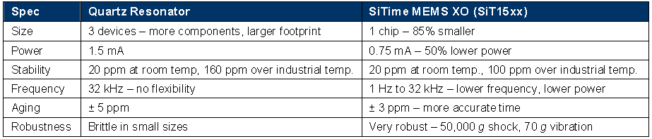 表1:石英晶體振蕩器與SiT15xx微機電系統(tǒng)振蕩器的匯總比較