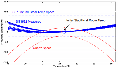 圖1比較了sit1532(采用sitime的MEMS技術的32.768khz振蕩器)和水晶制品的頻率穩定性.藍色虛線表示sit1532的頻率穩定性規格(100ppmp-p),紅色實線表示使用 音叉型石英振子的32.768khz振蕩器的一般頻率穩定性規格.