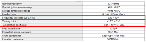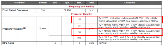 表1:石英基32.768千赫XTAL的頻率穩定性規格