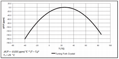 基于音叉型石英振子的32.768khz振蕩器的頻率穩定性一般以表示室溫25℃下的常溫頻率偏差和共振頻率相對于溫度變化的拋物線特性的兩個參數來表示.頻率溫度特性可根據制造商數據表中的變化點溫度和2次溫度系數進行計算.