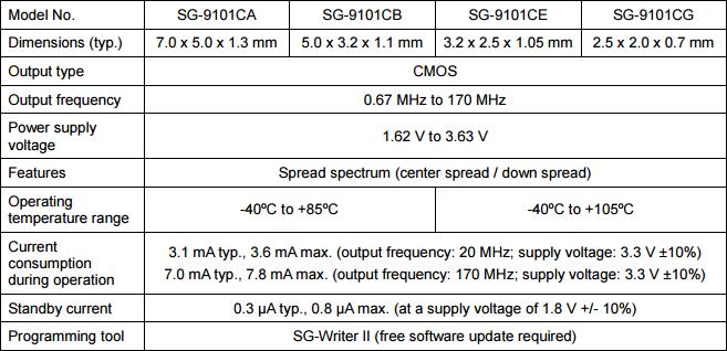 SG- 8101系列的振蕩器有大約66%收緊頻率公差和當前消費比同類產品低50%.SG- 9101系列振蕩器,它使用一個擴展頻譜消耗比較數據目前低于75%.用戶將能夠項目產品所需的輸出頻率,以及所需的輸出頻率調制和周期. 這些振子可以在各種環境條件下使用.他們也將極大地有助于性能,降低電力需求,快速發展周期和小批量生產.適用于:通訊設備、數碼科技、醫療設備、車載電子、智能穿戴設備、智能機器人、無人機以及高端的航空、軍事設備領域.